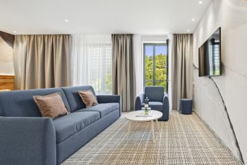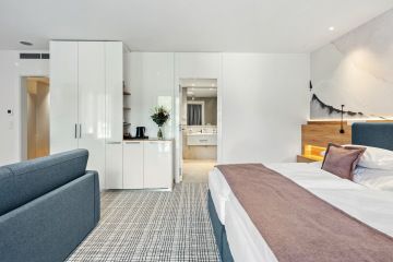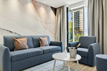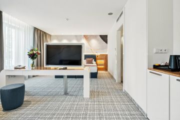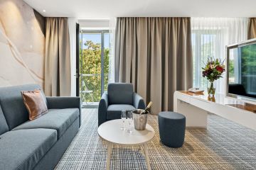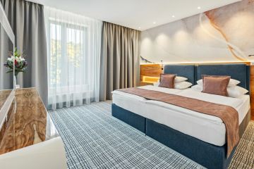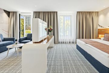 This spacious, air-conditioned room with a minimum size of 46 m² offers exceptional comfort and a unique view of Karlovy Vary. All rooms are located in the modern St. Joseph Tower and feature a generous 200 × 200 cm bed.