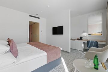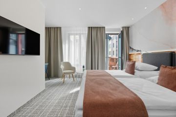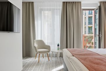 A luxurious, air-conditioned single room with a minimum area of 28 m², offering comfort and style in every detail. Each room features a spacious 200 × 200 cm bed to ensure perfect rest.